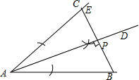 如图所示,线段BP即为所求;经测量PB=1.4cm,PE=1.4cm,