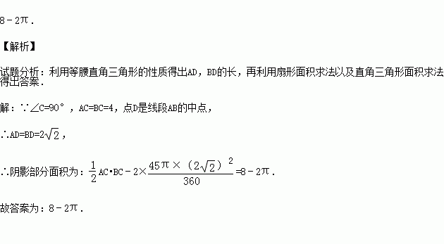 (2015秋•重庆校级期中)如图,Rt△ABC中,∠C=90°,AC=BC=4,点D是线段AB的中点,分别以点A,B为圆心,AD为半径画弧,分别交AC,BC于点E,F.则阴影部分面积为 (结果保留π).