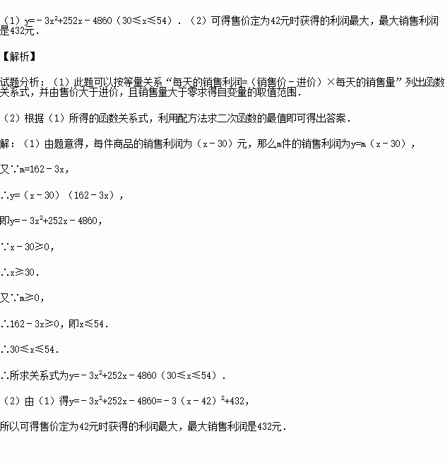 (2013•胶南市校级模拟)某商场以每件30元的价格购进一种商品,试销中发现,这种商品每天的销售量m(件)与每件的销售价x(元)满足一次函数:m=162﹣3x.