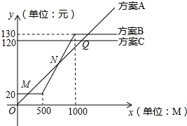 (3)如图设方案A的函数图象与方案B的函数图象交于点M、N,与方案C函数图象的交于点Q,则M(200,20),N(750,75),Q(1200,120),