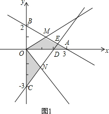 解答 解:(1)在y=-$\frac{2}{3}$x+2中,令y=0,可得x=3;令x=0,可得y=2,