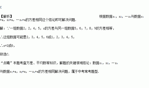 若一组数据2,3,4,5,x的方差与另一组数据25,26,27,28,29的方差相等,则x的值为( )