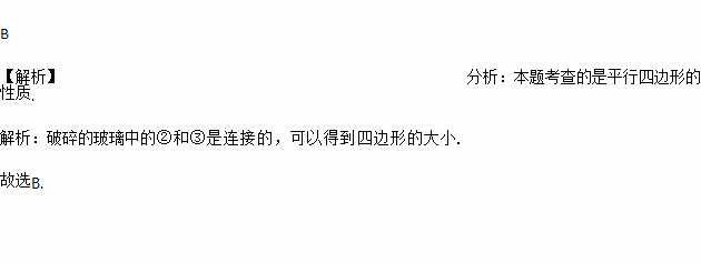 小敏不慎将一块平行四边形玻璃打碎成如图的四块,为了能在商店配到一块与原来相同的平行四边形玻璃,他带了两块碎玻璃,其编号应该是( )