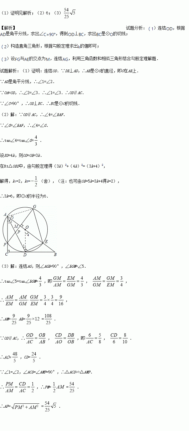 如图,在Rt△ABC中,∠C=90°,AD是角平分线,DE⊥AD交AB于E,△ADE的外接圆⊙O与边AC相交于点F,过F作AB的垂线交AD于P,交AB于M,交⊙O于G,连接GE.
