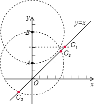 分析:根据线段垂直平分线上的点到线段两端点的距离相等可得AB的垂直平分线与直线y=x的交点为点C,再求出AB的长,以点A为圆心,以AB的长为半径画弧,与直线y=x的交点为点C,求出点B到直线y=x的距离可知以点B为圆心,以AB的长为半径画弧,与直线没有交点.