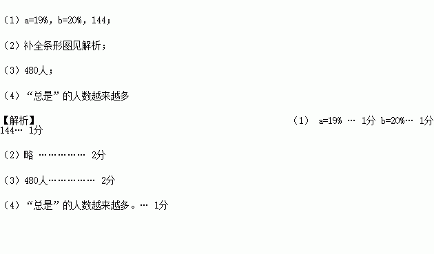 (1)a= %,b= %,“总是”对应阴影的圆心角为 °;