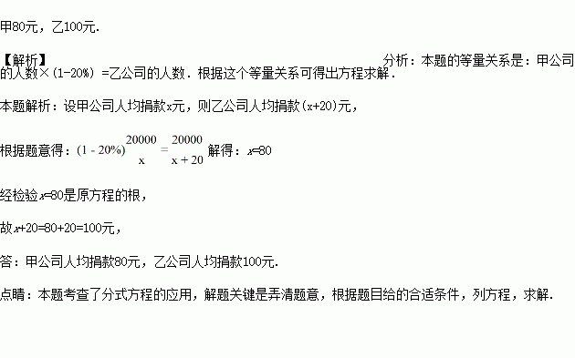 甲、乙两公司各为“希望工程”捐款20000元.已知乙公司比甲公司人均多捐20元,且乙公司的人数比甲公司的人数少20%.问甲、乙两公司人均捐款各为多少元?