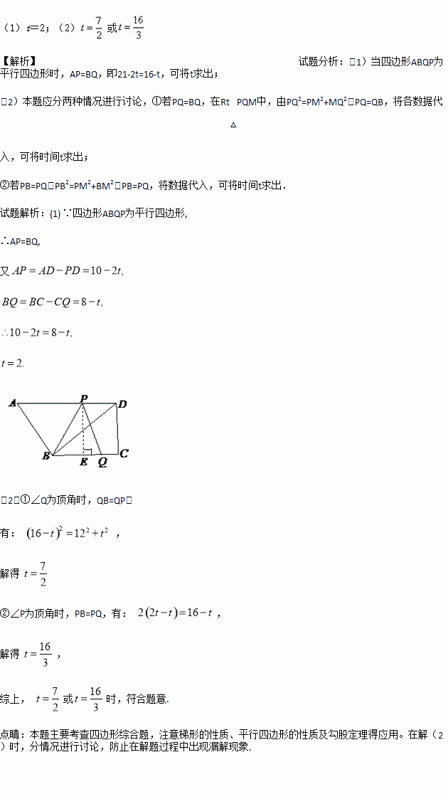 (2)当t为何值时,三角形BPQ是以BQ或BP为底边的等腰三角形?