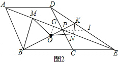 分析 根据菱形的性质得到AD∥BC,根据平行线的性质得到对应角相等,根据全等三角形的判定定理△ADP≌△ECP,由相似三角形的性质得到AD=CE,作PI∥CE交DE于I,根据点P是CD的中点证明CE=2PI,BE=4PI,根据相似三角形的性质得到$\frac{KP}{KB}=\frac{PI}{BE}$=$\frac{1}{4}$,得到BP=3PK,故③错误;作OG⊥AE于G,根据平行线等分线段定理得到MG=NG,又OG⊥MN,证明△MON是等腰三角形,故①正确;根据直角三角形的性质和锐角三角函数求出∠OMN=$\frac{\sqrt{3}}{3}$,故②正确;然后根据射影定理和三角函数即可得到PM•PA=3PD2,故④正确.