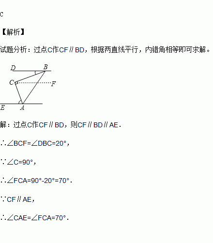 如图,在△ABC 中,∠C=90°.若BD∥AE,∠DBC=20°,则∠CAE的度数是 ( )