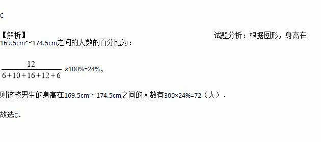 为了解中学300名男生的身高情况,随机抽取若干名男生进行身高测量,将所得数据整理后,画出频数分布直方图(如图).估计该校男生的身高在169.5cm~174.5cm之间的人数有( )