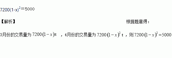 某蔬菜交易市场2月份的蔬菜交易量是7 200t,4月份降到5 000 t.设平均每月降低的百分率为x,则可列出方程为____________.(说明:只列出方程,不要求解)