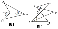 解决问题1:根据四边形的内角和等于360°可得(180°-∠1)+∠P+∠4+∠B=360°,∠2+∠P+(180°-∠3)+∠D=360°,然后整理即可得解;