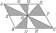 如图,?ABCD中,AD=10,AD边上的高为8,对角线交点为O,直线EF经过O,与AB、CD分别交于点E、F;直线GH经过点O,与AD、BC分别交于点G、H;直线MN经过点O,与AD、BC分别交于点M、N,则图中阴影部分的面积为