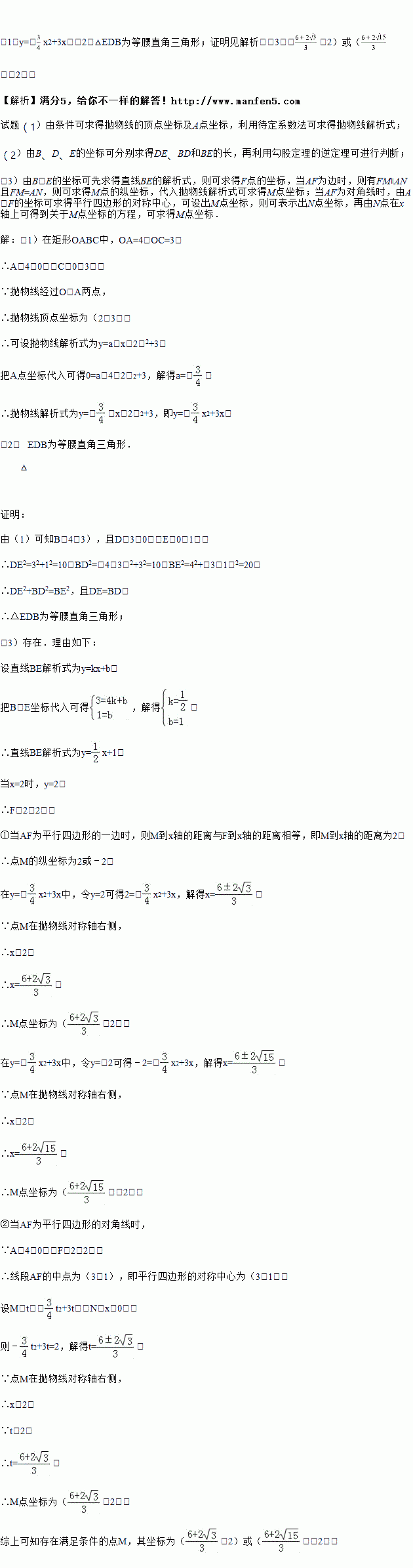 如图,在平面直角坐标系中,矩形OABC的顶点A,C分别在x轴,y轴的正半轴上,且OA=4,OC=3,若抛物线经过O,A两点,且顶点在BC边上,对称轴交BE于点F,点D,E的坐标分别为(3,0),(0,1).