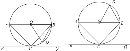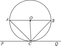 如图,线段AB是圆O的直径,直线PQ经过圆上一点C,PQ∥AB,连结AC、BC,且AC=BC,AC=5