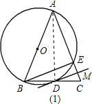 分析:(1)连接AD,因为AB是圆O的直径,所以∠ADB=90°,即AD⊥BC,再根据等腰三角形的性质:“三线合一”即可证的D点为BC中点;