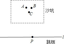 小云参加跳远比赛,他从地面跳板P处起跳落到沙坑中,两脚印分别为A,B两点,人未站稳,一只手撑到沙坑C点,如图所示.请你画出小云跳远成绩所在的垂线段,并说明理由?