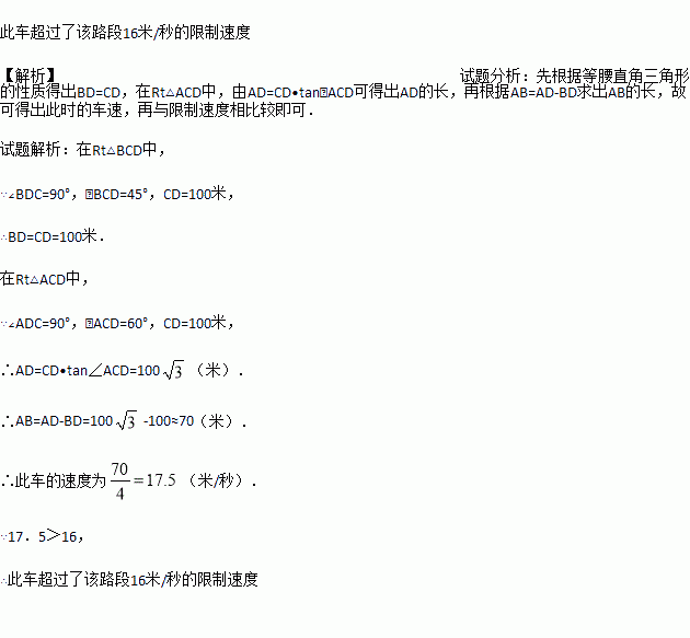 据调查,超速行驶是引发交通事故的主要原因之一.上周末,小明和三位同学用所学过的知识在一条笔直的道路上检测车速.如图,观测点C到公路的距离CD为100米,检测路段的起点A位于点C的南偏西60°方向上,终点B位于点C的南偏西45°方向上.某时段,一辆轿车由西向东匀速行驶,测得此车由A处行驶到B处的时间为4秒. 问此车是否超过了该路段16米/秒的限制速度?(参考数据: