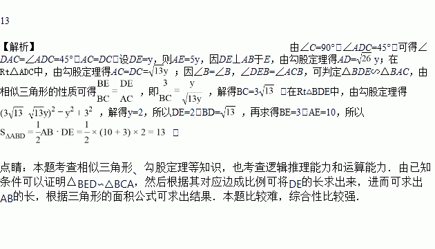 如图,在△ABC中,∠C=90°,D是BC边上一点,DE⊥AB于E,∠ADC=45°,若DE:AE=1:5,BE=3,则△ABD的面积为_______.