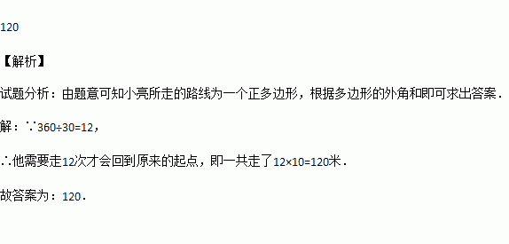 如图,小亮从A点出发,沿直线前进10米后向左转30°,再沿直线前进10米,又向左转30°,…,照这样走下去,他第一次回到出发地A点时,一共走了 米.