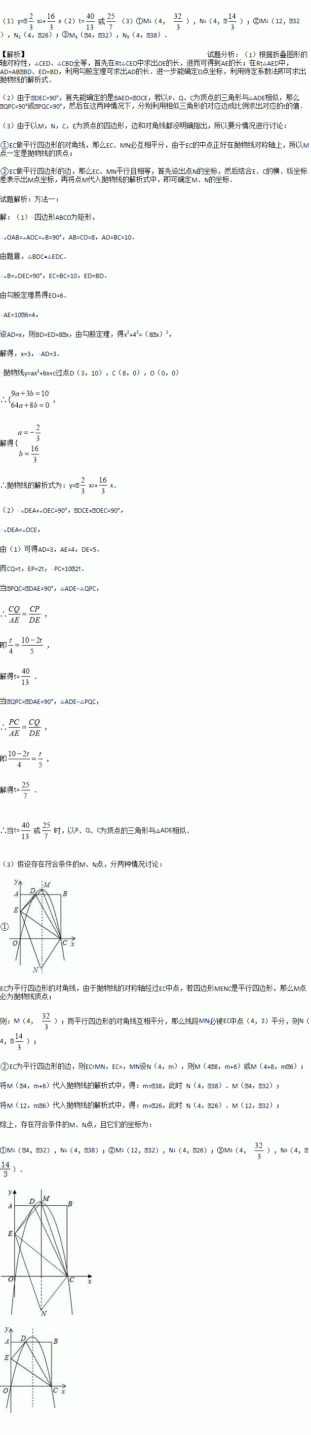 如图,在矩形OABC中,AO=10,AB=8,沿直线CD折叠矩形OABC的一边BC,使点B落在OA边上的点E处,分别以OC,OA所在的直线为x轴,y轴建立平面直角坐标系,抛物线y=ax2+bx+c经过O,D,C三点.