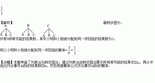 “2016重庆国际马拉松”的赛事共有三项:A、“全程马拉松”、 B、“半程马拉松”、C、“迷你马拉松”,小明和小刚参加了该项赛事的志愿者服务工作,组委会随机将志愿者分配到以上三个项目组,则小明和小刚被分配到同一项目组的概率是_______.