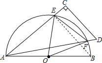 如图,AB为量角器(半圆O)的直径,等腰直角△BCD的斜边BD交量角器边缘于点G,直角边CD切量角器于读数为60°的点E处(即弧AE的度数为60°),第三边交量角器边缘于点F处.