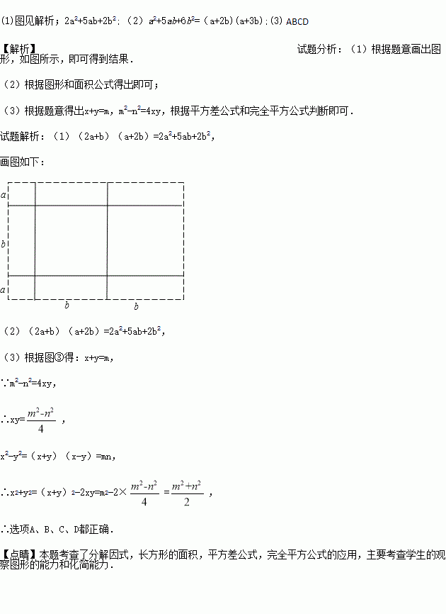 (1)取图①中的若干个(三种图形都要取到)拼成一个长方形,使其面积为(2a+b)(a+2b),在虚框中画出图形,并根据图形回答(2a+b)(a+2b)=_____________