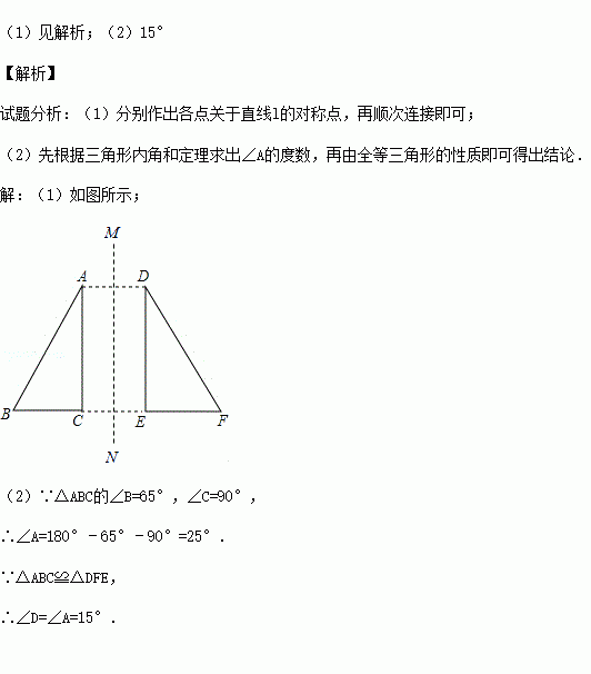 (1)在图中画出△ABC关于直线MN对称的△DFE,使点A与点D是对称点,点C与点E是对称点;