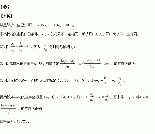 ①y1与y2的开口方向,开口大小不一定相同; ②y1与y2的对称轴相同;③若y2的最值为m,则y1的最值为k2m;④若函数