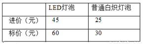 LED灯具有环保节能、投射范围大、无频闪、使用寿命较长等特点,在日常生活中,人们更倾向于LED灯的使用,某校数学兴趣小组为了解LED灯泡与普通白炽灯泡的销售情况,进行了市场调查:某商场购进一批30瓦的LED灯泡和普通白炽灯泡进行销售,其进价与标价如下表: