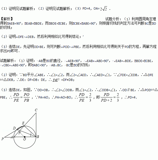 (3)在(2)的条件下,延长ED,BA交于点P,若PA=AO,DE=2,求PD的长和⊙O的半径.