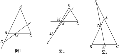 (1)如图(1),当点E在线段AC上,点D在AB延长线上时,若BD=CE,请判断线段MD和线段ME的数量关系,并证明你的结论.