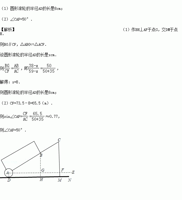 一种拉杆式旅行箱的示意图如图所示,箱体长AB=50cm,拉杆最大伸长距离BC=35cm,(点A、B、C在同一条直线上),在箱体的底端装有一圆形滚轮⊙A,⊙A与水平地面切于点D,AE∥DN,某一时刻,点B距离水平面38cm,点C距离水平面59cm.