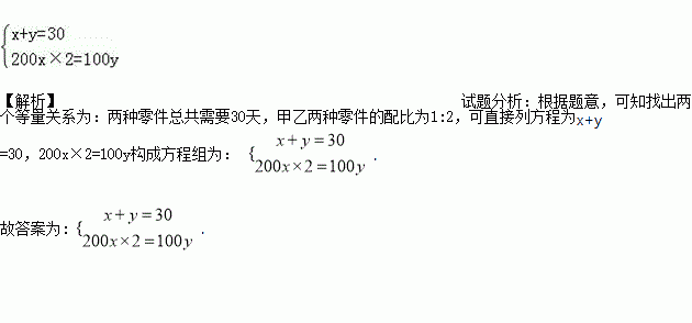 某玩具车间每天能生产甲种零件200个或乙种零件100个.甲种零件1个与乙种零件2个能组成一个完整的玩具,问怎样安排生产才能在30天内组装出最多的玩具?若设生产甲种零件x天,乙种零件y天,则根据题意列二元一次方程组是__.