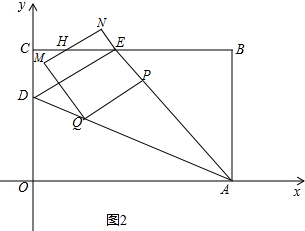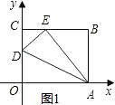 分析 (1)如图1依题意可知,折痕AD是四边形OAED的对称轴,于是得到在Rt△ABE中,AE=AO=5,AB=4,BE=$\sqrt{{AE}^{2}{-AB}^{2}}$=$\sqrt{{5}^{2}{-4}^{2}}$=3,求得CE=2,E点坐标为(2,4),在Rt△DCE中,DC2+CE2=DE2,因为DE=OD,所以(4-OD)2+22=OD2,解得OD=$\frac{5}{2}$,求得D点坐标为(0,$\frac{5}{2}$);