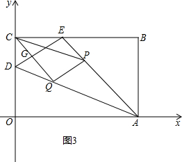 (4)如图3,由△CPQ是直角三角形,可判定只有∠CQP=90°,根据DE∥PQ得到CQ⊥DE,因为∠DCE=90°,根据射影定理得到CE2=DE•GE,即22=$\frac{5t}{2}$•t,求得t=$\frac{8}{5}$.