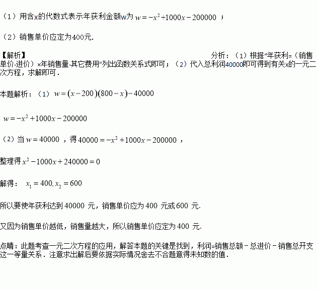 ½ñÄê³õ£¬Ä³·þ×°¾ÏúÉÌ·¢ÏÖij¿îÐÂÐÍÔ˶¯·þÊг¡ÐèÇóÁ¿½Ï´ó£¬¸Ã·þ×°µÄ½ø¼ÛΪ200Ôª£¯¼þ£¬Ã¿ÄêÖ§¸¶Ô±¹¤¹¤×ʺͳ¡µØ×â½ðµÈÆäËü·ÑÓÃ×ܼÆ40000Ôª£®¾¹ýÊг¡µ÷²é·¢ÏÖÈôÏúÊÛµ¥¼ÛΪxÔª£¯¼þ£¬ÔòÄêÏúÊÛÁ¿Îª£¨800£x£©¼þ£®