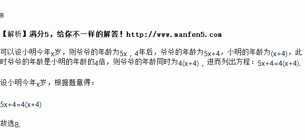 小明爷爷今年的年龄是小明的5倍,4年后,爷爷的年龄是小明的4倍,求小明今年的年龄?设小明今年的年龄为岁,根据题意,列出方程正确的是( )![]()