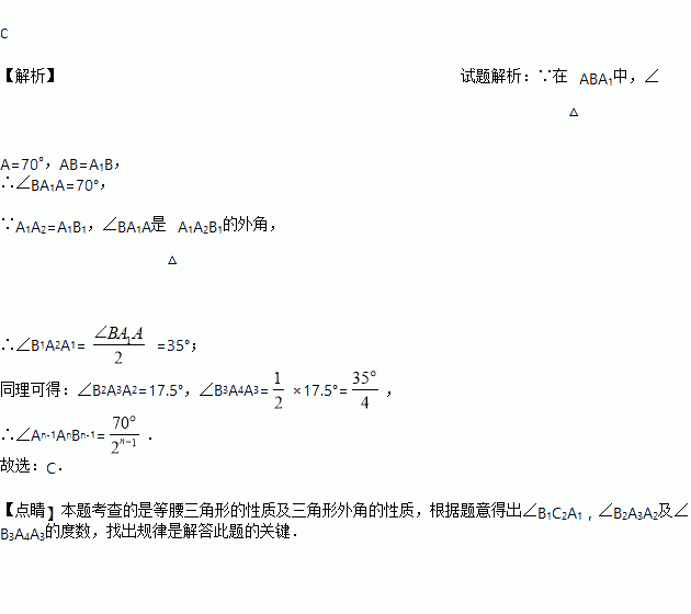 如图,已知AB=A1B,A1B1=A1A2,A2B2=A2A3,A3B3=A3A4…,若∠A=70°,则∠An的度数为( )