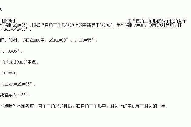 如图,△ABC中,∠ACB=90°,∠B=55°,点D是斜边AB的中点,那么∠ACD的度数为( )