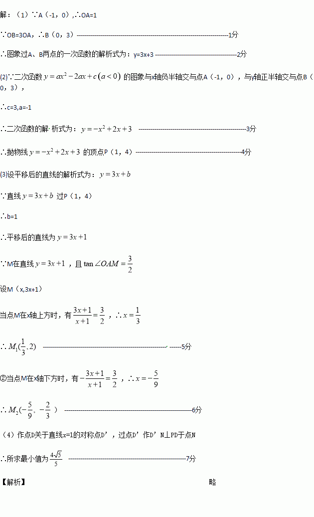 的图象与x轴负半轴交于点A(-1,0),与y轴正半轴交与点B,顶点为P,且OB=3OA,一次函数y=kx+b的图象经过A、B.