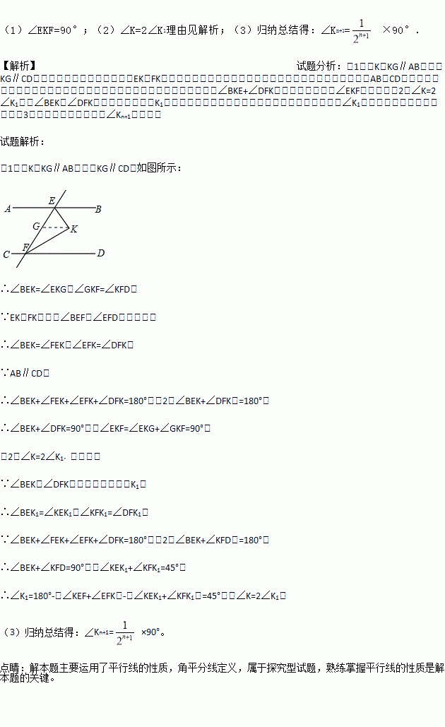 已知:如图(1),直线AB∥CD,EF分别交AB、CD于E、F两点,∠BEF、∠DFE的平分线相交于点K.(1)求∠EKF的度数.(计算过程不准用三角形内角和)(2)如图(2),∠BEK、∠DFK的平分线相交于点K1,问∠K1与∠K的度数是否存在某种特定的等量关系?写出结论并证明.(3)在图2中作∠BEK1、∠DFK1的平分线相交于点K2,作∠BEK2、∠DFK2的平分线相交于点K3,依此类推,作∠BEKn、∠DFKn的平分线相交于点Kn+1,请用含的n式子表示∠Kn+1的度数.(直接写出答案,不必写解答过程)