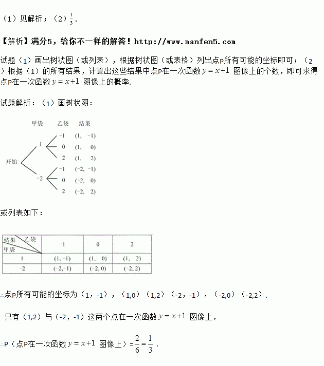 有甲、乙两个不透明的布袋,甲袋中有两个完全相同的小球,分别标有数字1和-2;乙袋中有三个完全相同的小球,分别标有数字-1、0和2.小丽先从甲袋中随机取出一个小球,记录下小球上的数字为x;再从乙袋中随机取出一个小球,记录下小球上的数字为y,设点P的坐标为(x,y).