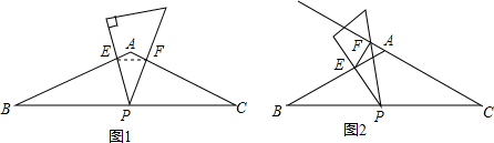 (1)如图1,当三角板的两边分别交边AB、AC于点E、F,连接EF,请说明△BPE∽△CFP;
