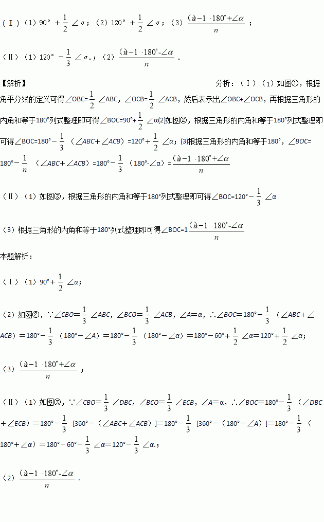 ∠ACB,∠A=α,试求∠BOC的度数 (用α表示).(3)归纳猜想