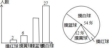 (2)摸蓝球的人数为:50-2-6-27=15,如图所示,![]()
