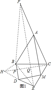 分析 (1)方法一,如图1,延长CA至F点,使得AB=AC=AF,连接BF,得到△FBC为直角三角形,∠FBC=90°,延长ED至H点,使得DB=DE=DH,连接BH,BE,得到△HBE为直角三角形,∠HBE=90°,推出△FBC∽△HBE,得到$\frac{FB}{BE}=\frac{CB}{HB}$,证得△FBE∽△CBH,得到∠BHC=∠BEF,推出FE⊥CH,根据三角形的中位线的性质即可得到结论;