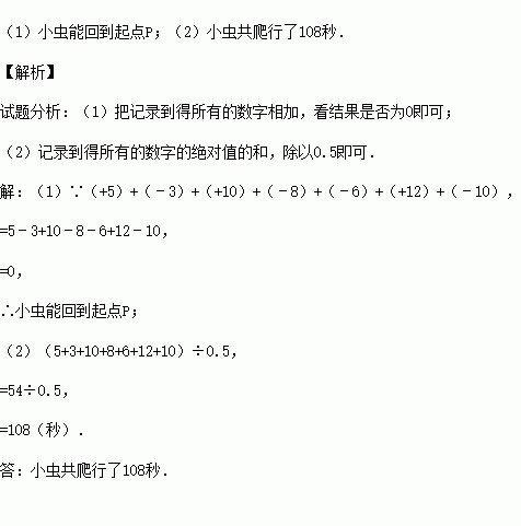 (2015秋•沧州期末)一只小虫从某点P出发,在一条直线上来回爬行,假定把向右爬行的路程记为正数,向左爬行的路程记为负数,则爬行各段路程(单位:厘米)依次为:+5,﹣3,+10,﹣8,﹣6,+12,﹣10.